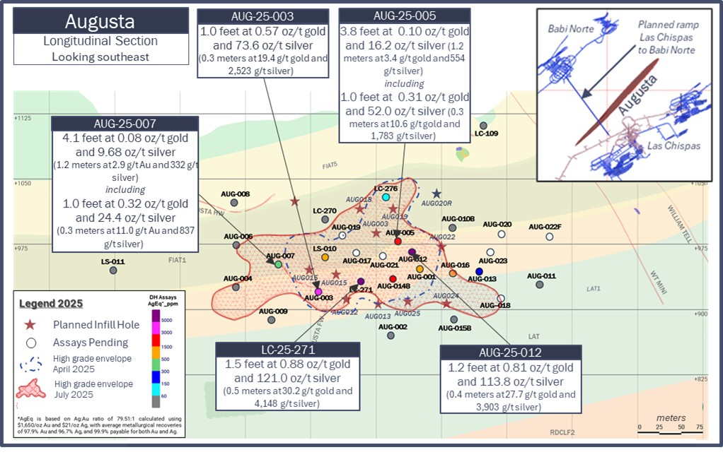 - Hole AUG-25-012 returned 1.2 feet at 0.81 oz/t and 113.8 oz/t silver (0.4 meters at 27.7 g/t Au and 3,903 g/t